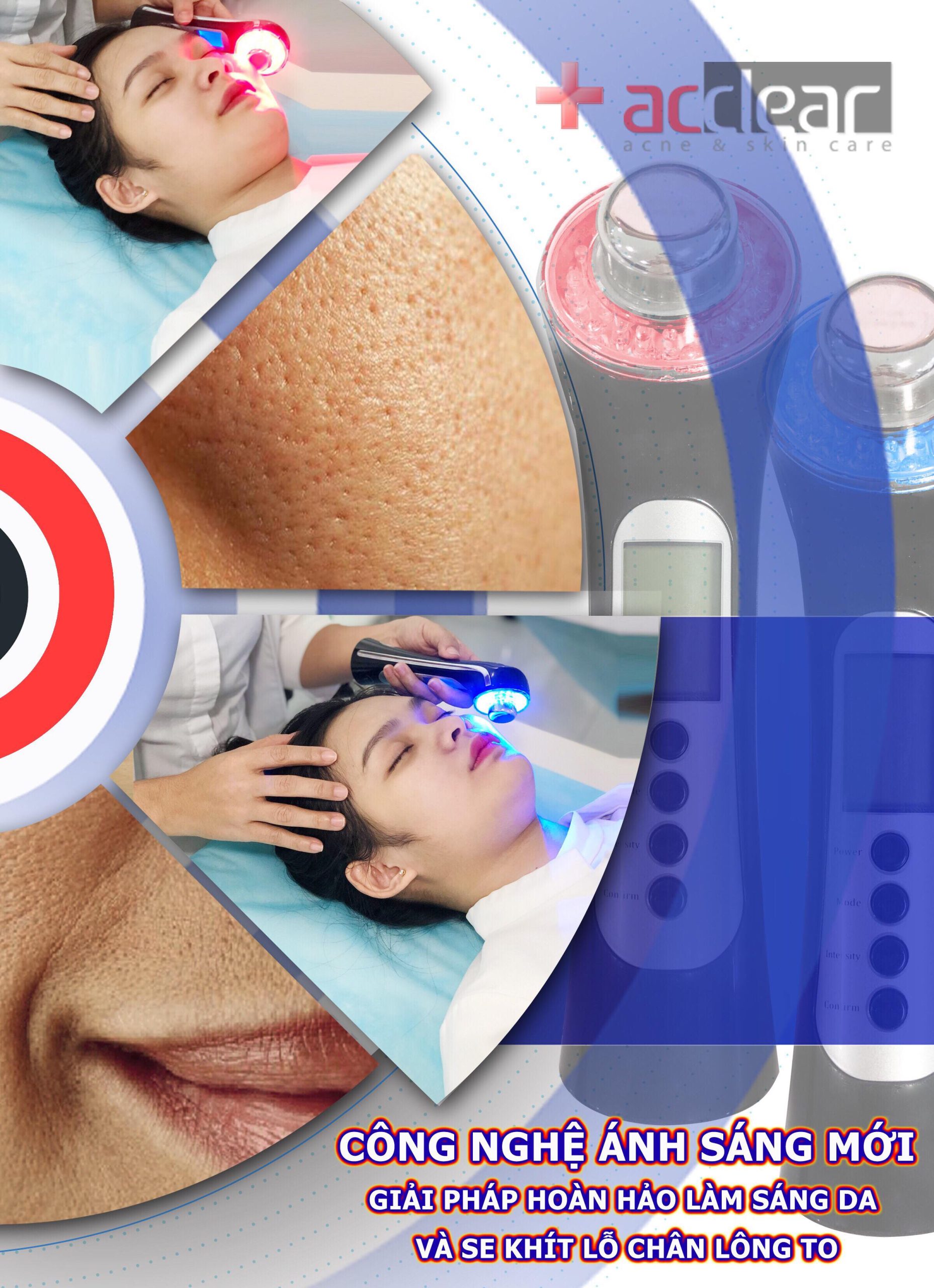 Sau một thời gian thực nghiệm lâm sàng dưới sự tư vấn của các chuyên gia nước ngoài, TRUNG TÂM ACCLEAR trân trọng mang công nghệ ánh sáng sinh học đa năng,cùng hiệu ứng sóng siêu âm tần số thấp vào liệu trình chăm sóc da truyền thống của Trung Tâm, tác dụng hữu hiệu LÀM SÁNG DA VÀ SE KHÍT LỖ CHÂN LÔNG chỉ trong một thời gian cực ngắn, thu nhỏ lỗ chân lông đến 90%, đồng thời giảm mụn, xóa nếp nhăn, nâng cơ, da săn chắc mịn màng hơn cả mong đợi.